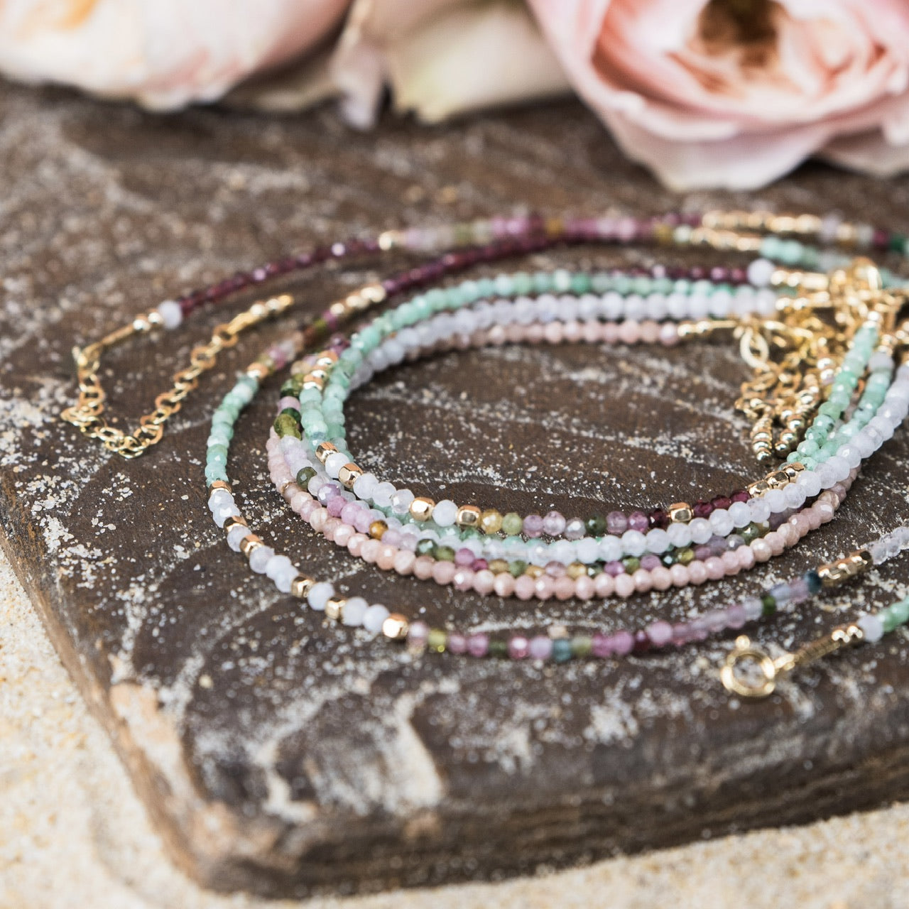 Indémodable. La collection Gems s’agrandit! Craquez pour ce mélange de couleurs pastels parfait pour la saison! Ce collier de pierres gemmes et perles pépites en gold filled 14k habillera votre décolleté avec élégance et modernité.