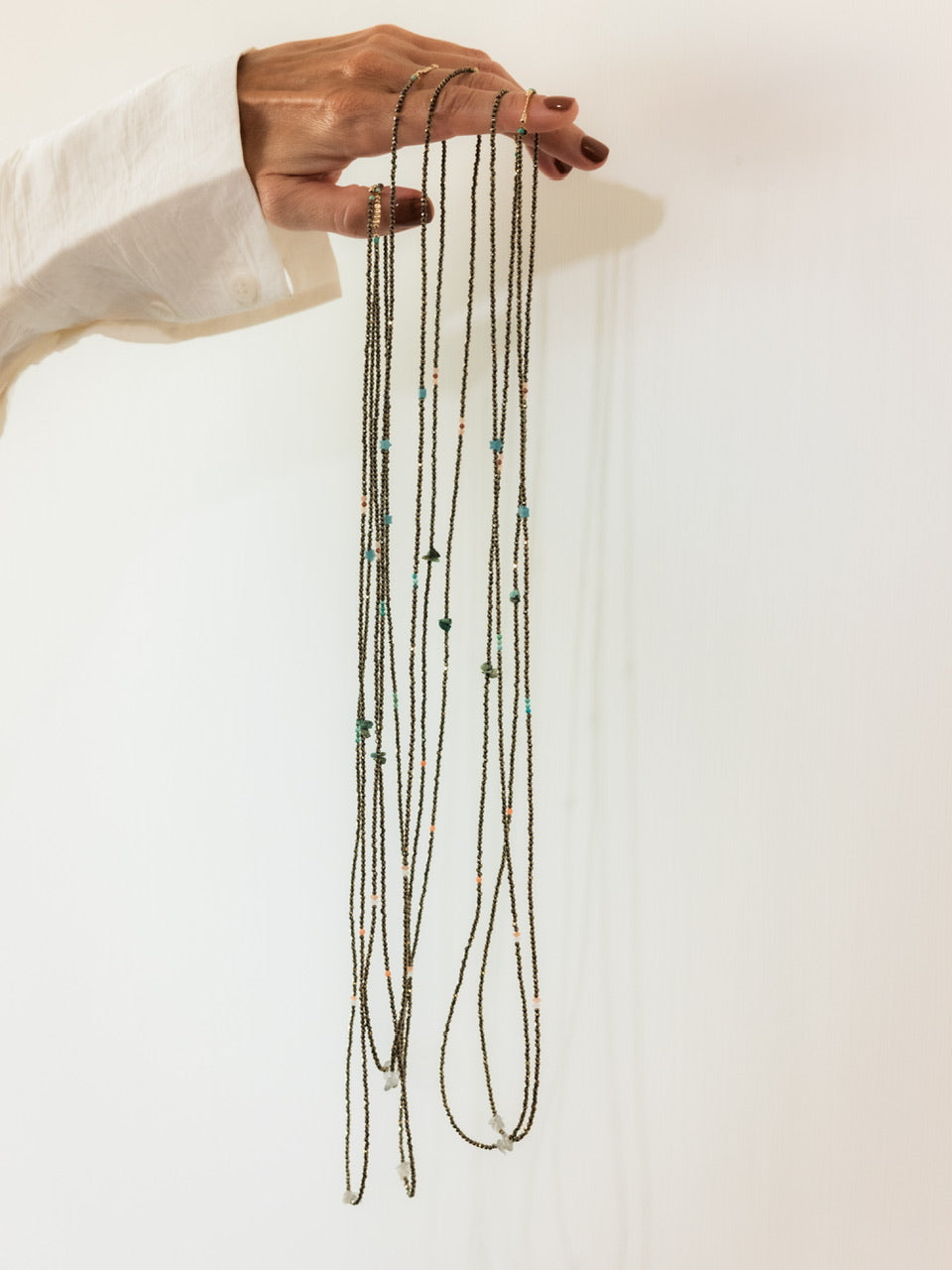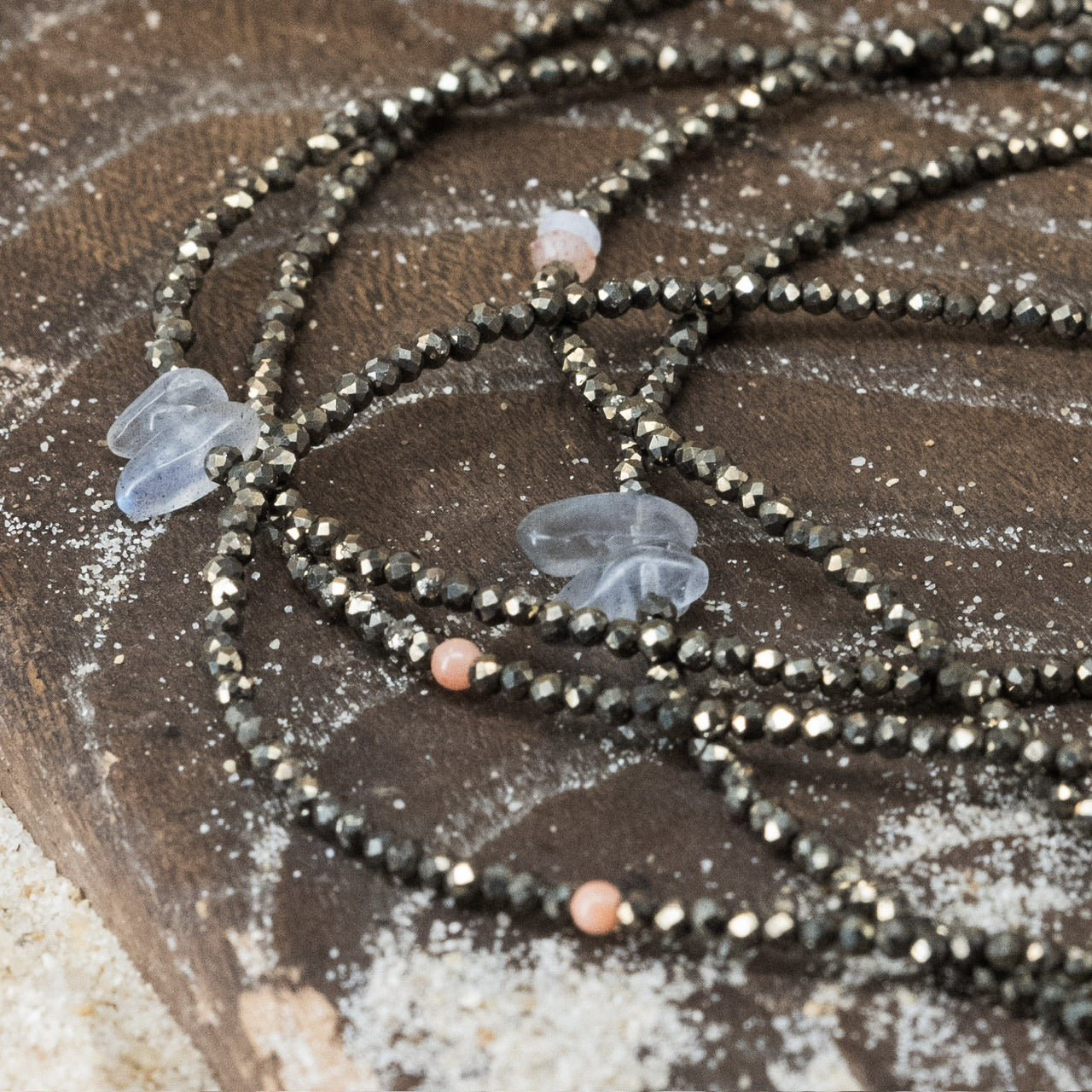 Bohème. La pierre brute Pyrite est parfaitement mise à l’honneur dans cette création aux reflets or. Un brin bohème grâce à ces petites pierres gemmes, ce collier à l’éclat unique sublimera votre décolleté.