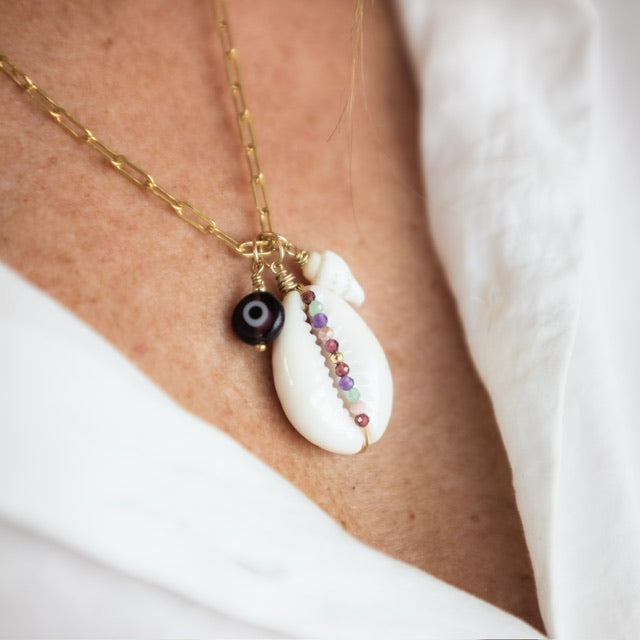 Coquillage précieux. Le coquillage est parfaitement mis à l’honneur dans cette nouvelle création grâce aux perles gemmes, ses breloques et sa chaîne Gold filled 14k. Un coquillage destiné à être porté tout au long de l’année et qui sublimera votre décolleté.