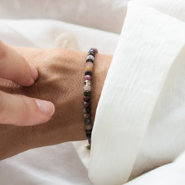 Craquez pour ce dégradé de couleurs sublimes, du rose en passant par une pointe de gris et noir… Voilà les teintes incomparables de la pierre Tourmaline! Les pierres gemmes facettées se suffisent à elles-mêmes. Ce bracelet habillera votre poignet avec charme et élégance.