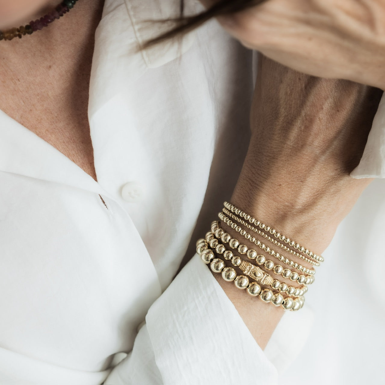 Un brin ethnique. La ligne intemporelle de perles or de 5mm met en valeur la perle ethnique centrale travaillée et fait de ce bracelet un essentiel. La simplicité est efficace. Elle est un atout majeur dans l’art du Mix & Match.