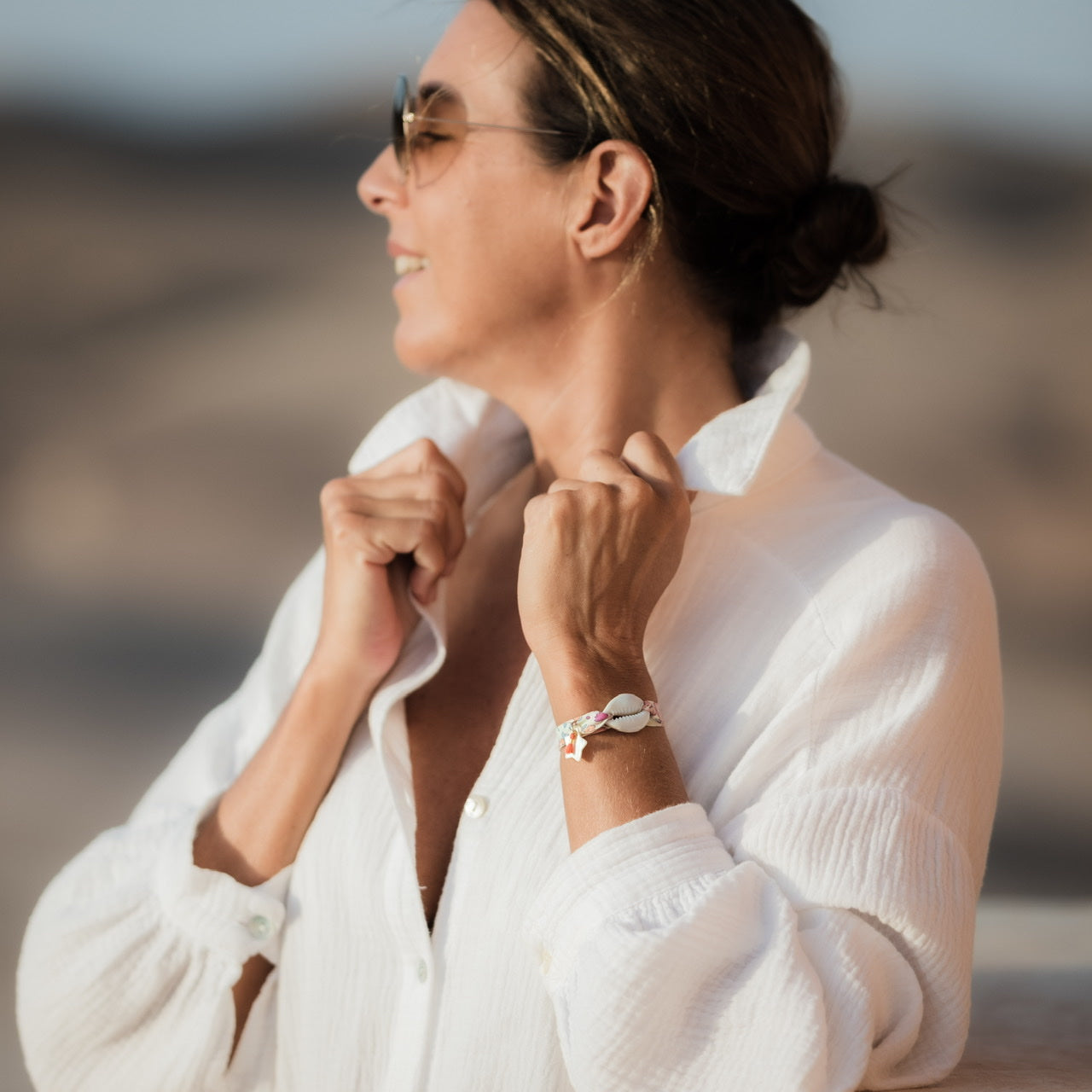 We activate our Good vibes mode with this XL Cauri shell brought back from Bali, twisted into a romantic version thanks to its Liberty ribbon.